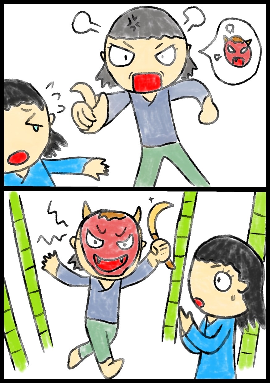 お清は、自分を驚かせた鬼の正体が義母だと知って驚き、そのお面が顔にくっついて外れないということにまた驚きます。心配するお清に義母は全てを打ち明けます。