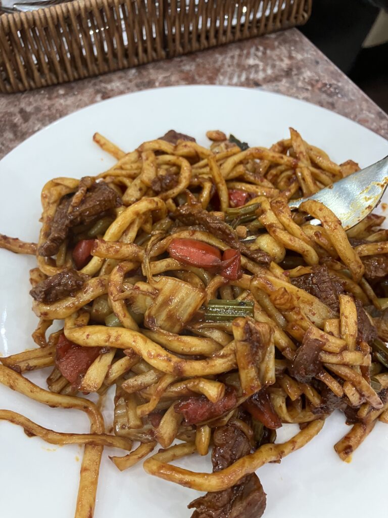 ラグマンはシンプルで正直な味付け。普段料理をしない男子学生が肉や野菜を炒め、適当に醤油やソースをドボドボいれて、たまたま完成した奇跡の一皿のような味付け。
