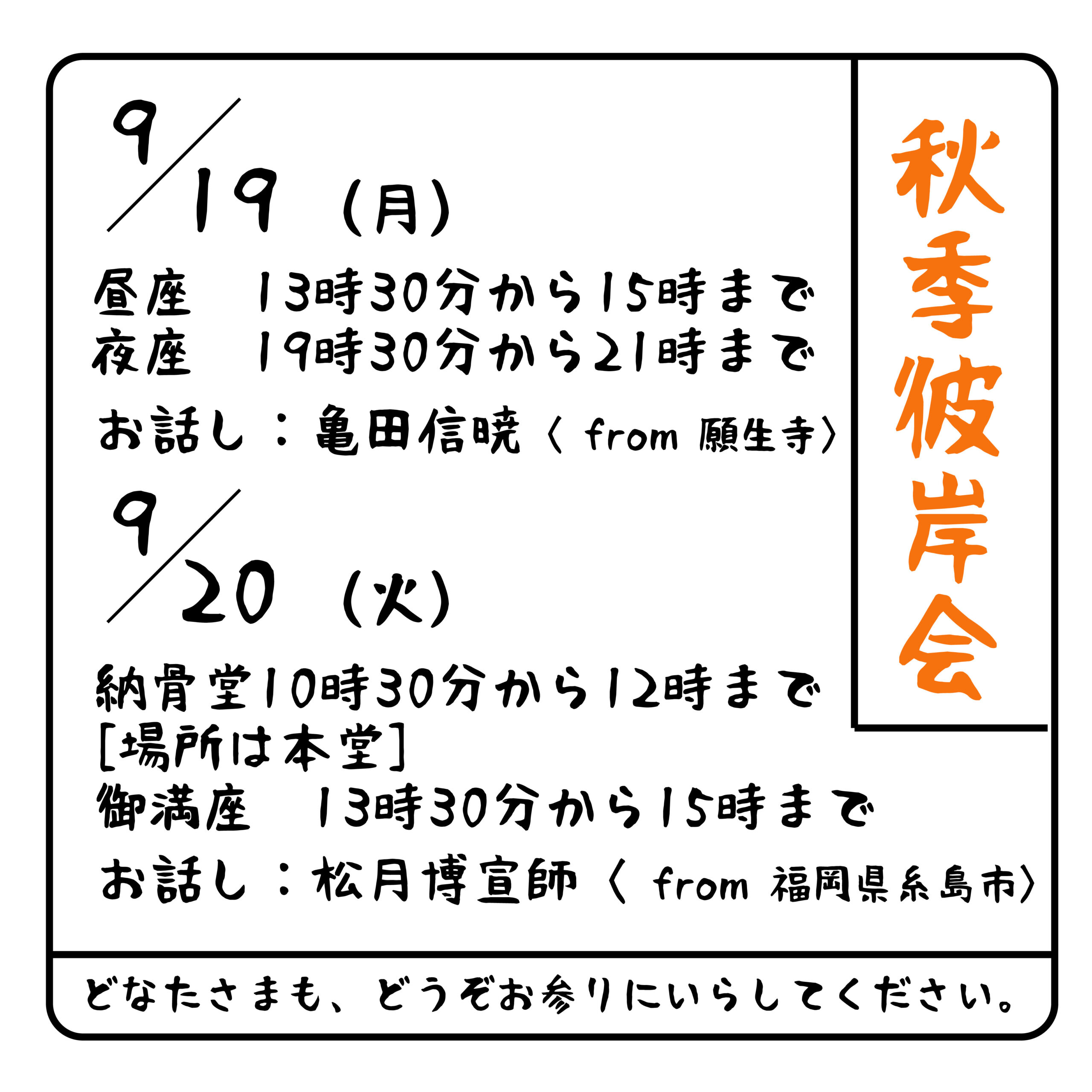 秋の彼岸会太陽が真西に沈むこの時期に、先だった方が参られた西方浄土に心を向け、自分の命の行く先に思いを馳せるお彼岸がやってまいります。お寺では下の日程で法要を勤めますので、是非いらしてください。読経のあと、法話があります。
