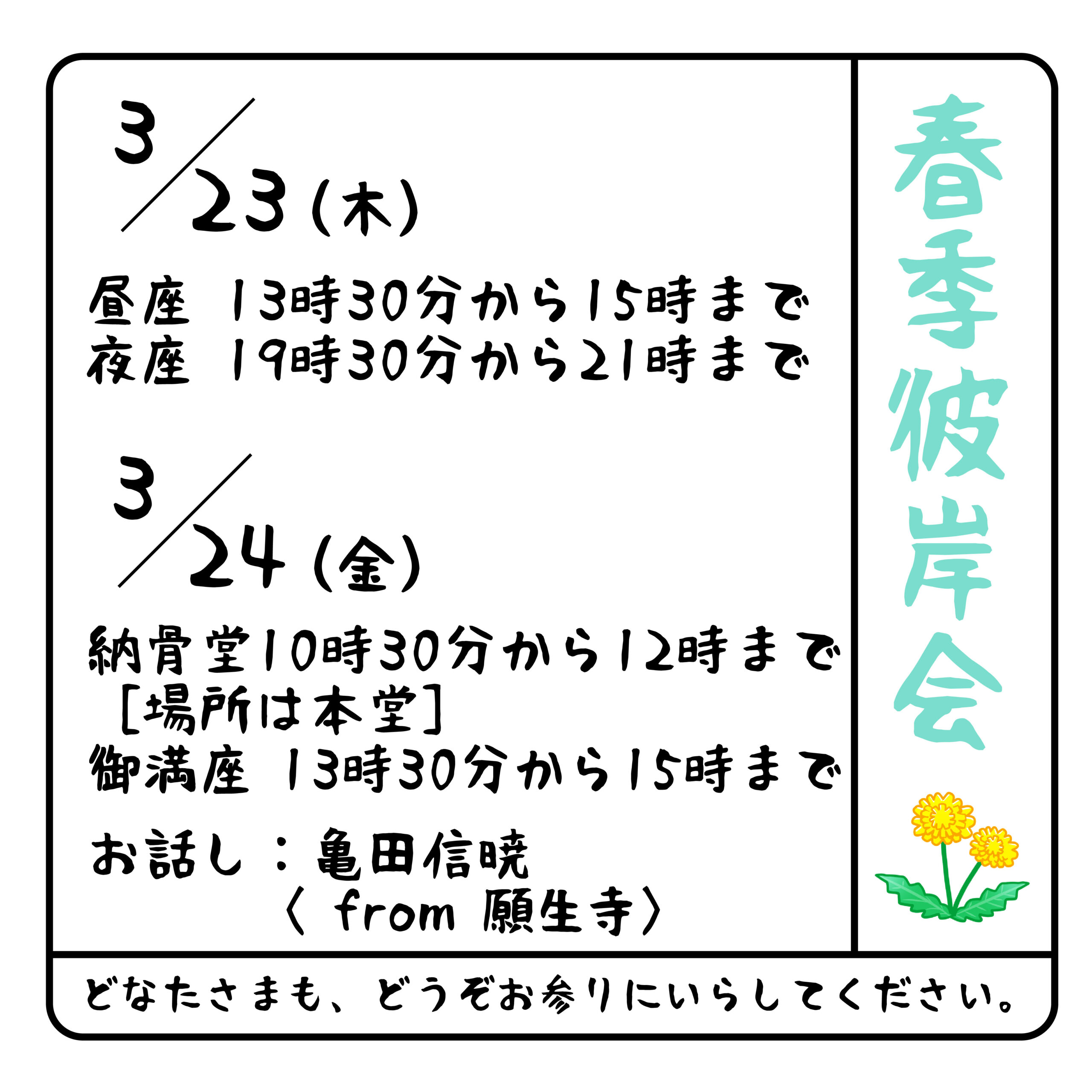 太陽が真西に沈むこの時期に、先だった方が参られた西方浄土に心を向け、自分の命の行く先に思いを馳せるお彼岸がやってまいります。お寺では下の日程で法要を勤めますので、是非いらしてください。読経のあと、法話があります。