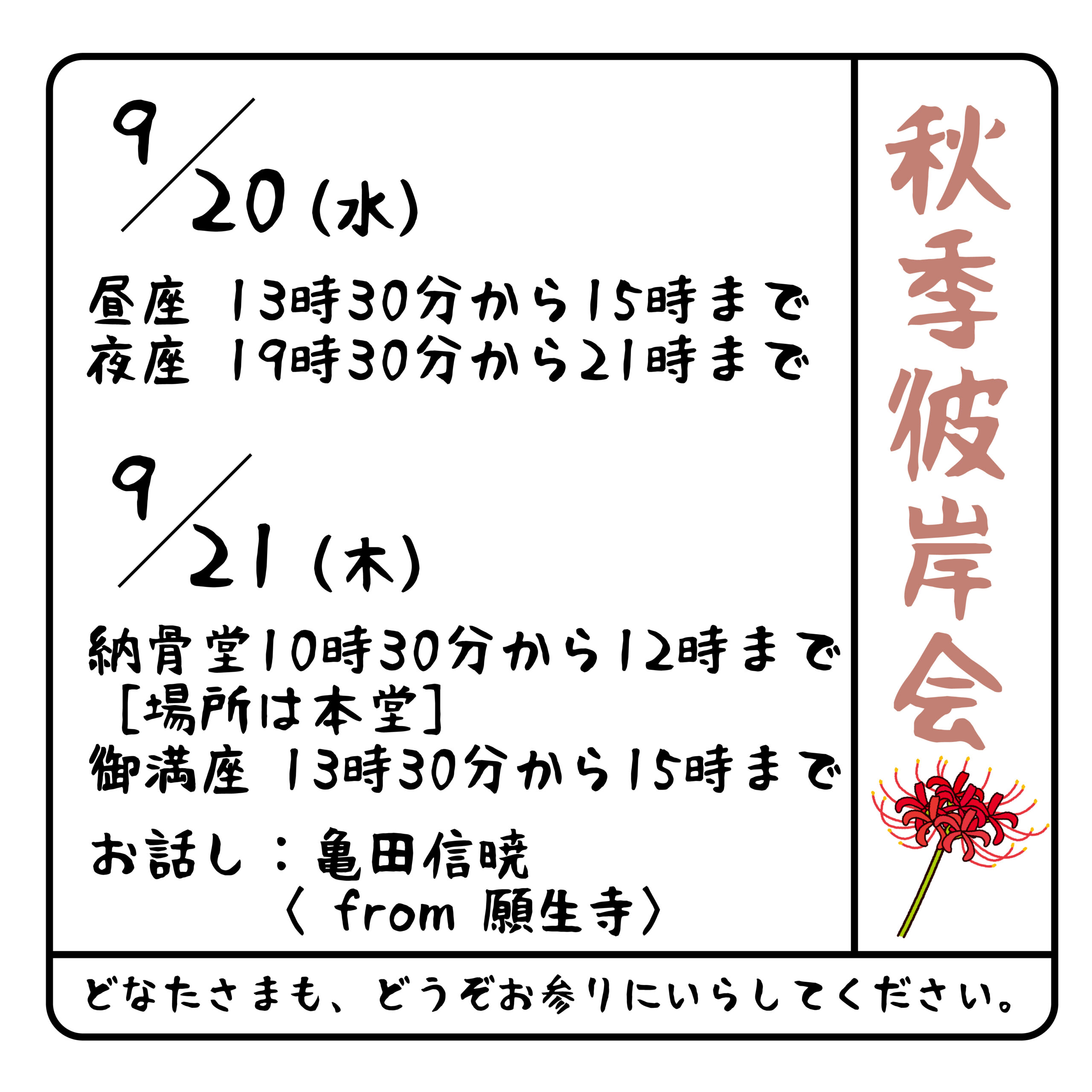 太陽が真西に沈むこの時期に、先だった方が参られた西方浄土に心を向け、自分の命の行く先に思いを馳せるお彼岸がやってまいります。お寺では下の日程で法要を勤めますので、是非いらしてください。読経のあと、法話があります。
