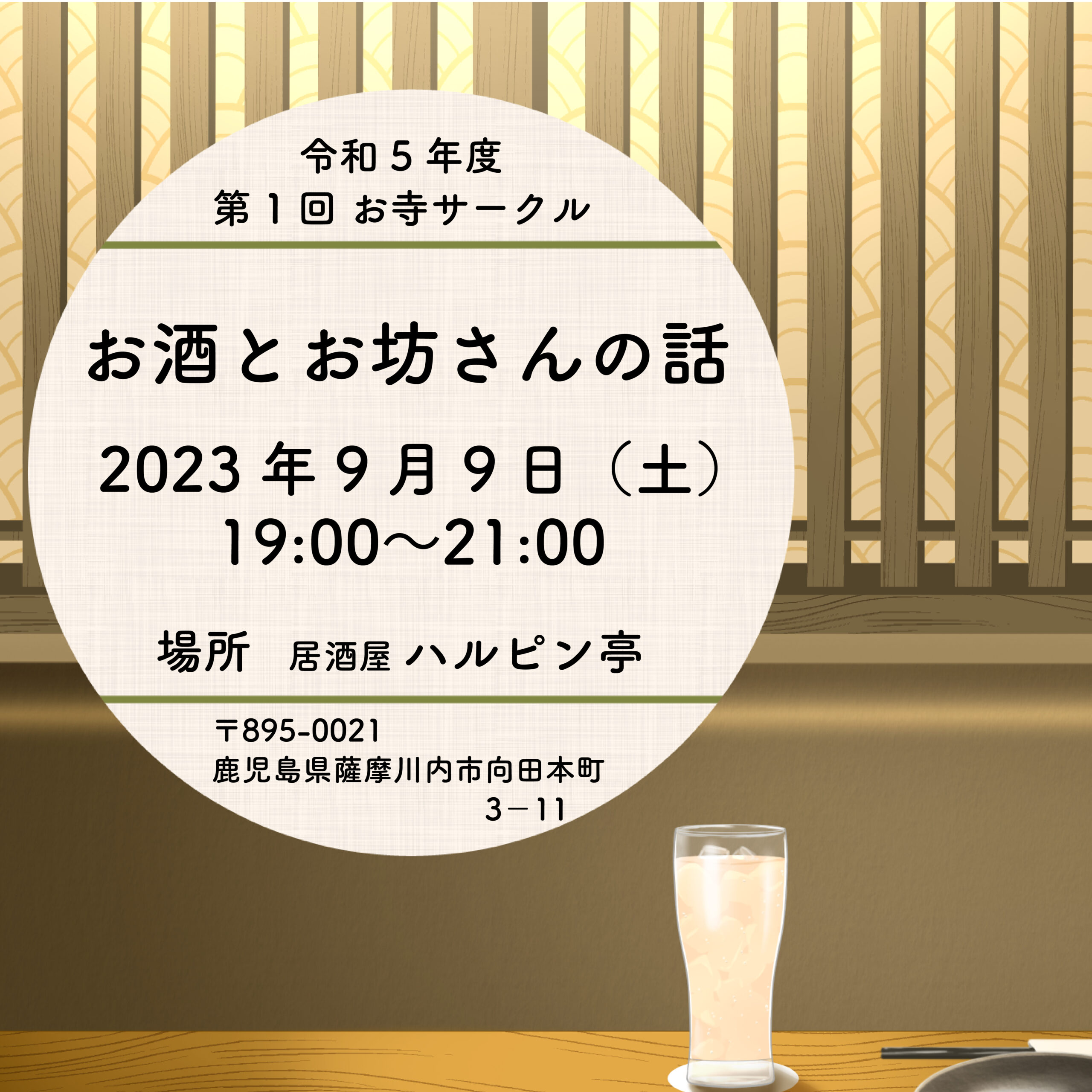参加者とお坊さんがごちゃ混ぜになって、お酒を飲みましょう!仏教の話の時間もあります!おどなたさまでも参加できます。仏さまのお話はお寺だけじゃない!ぜひお待ちしております!