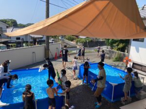 9:30 水遊び (簡易プールに加え、周りに射的・輪投げなどのゲームやかき氷屋などを設置して自由に遊びます)