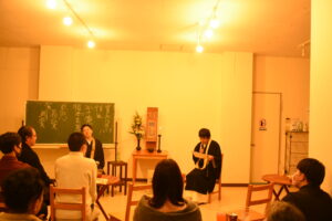 ゲスト僧侶に福岡県飯塚市正恩寺の僧侶で、龍谷大学の教授でいらっしゃる井上見淳先生をお招きし、前半は仏教のお話を聞かせていただき、後半は参加者からいただいた「嫌いな人とうまく付き合うには?」「生きる意味はなに?」などの様々な質問にお答えいただきました。